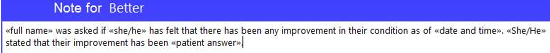 At the bottom of the Horizontal Choice Answers screen there are 2 options and a button labeled “Set up SOAP note”. If you select “One SOAP note containing the answer selected” you will have 1 standard note entered regardless of what was selected detailing what they stated, for example I selected marked improvement, the note could be “Patient was asked about their overall improvement since beginning care, they stated <<patient answer>>” where <<patient answer>> would be “marked”. The other option would be to select a SOAP note for each answer, in which you can configure you note to be worded differently for each possible answer.